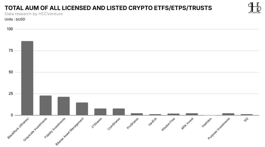 AUM của toàn bộ các Crypto ETFs/ETPs/Trusts đã được cấp phép và niêm yết cho thấy một thực tế rất rõ ràng khi dòng vốn thể chế vào thị trường crypto đang tập trung cực mạnh, và Bitcoin ETF chính là kênh dẫn vốn trung tâm. Bitcoin ETF đóng vai trò “xương sống” của quá trình này, và mức độ tập trung AUM cao cho thấy thị trường crypto đang được tích hợp sâu vào hệ thống tài chính toàn cầu.