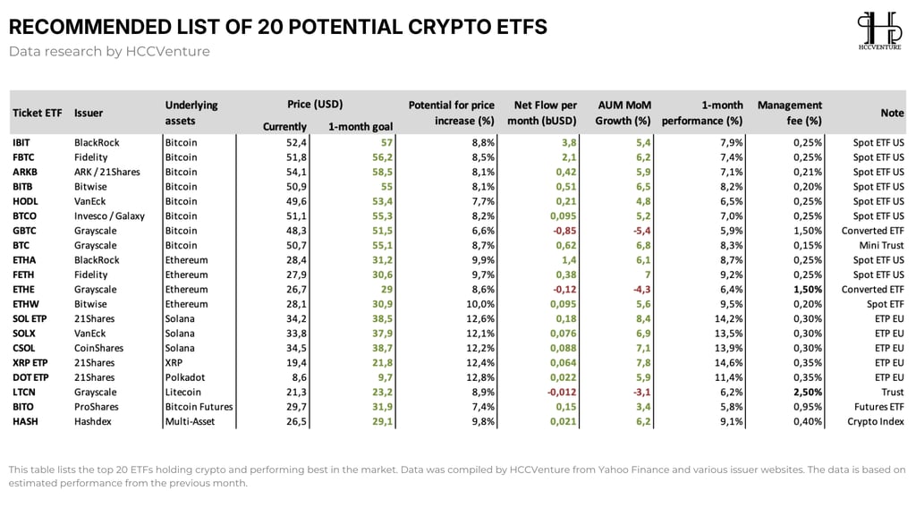 Dòng vốn ETF crypto hiện tại vẫn xoay quanh Bitcoin như trụ cột trung tâm, với nhóm ETF spot Bitcoin tại Mỹ chiếm ưu thế tuyệt đối cả về net flow hàng tháng, tăng trưởng AUM MoM và hiệu suất 1 tháng. Các quỹ như IBIT của BlackRock và FBTC của Fidelity đang dẫn đầu về quy mô dòng tiền ròng, lần lượt đạt khoảng 3,8 tỷ USD và 2,1 tỷ USD mỗi tháng, phản ánh rõ ràng việc nhà đầu tư tổ chức ưu tiên các sản phẩm có tính pháp lý cao, thanh khoản sâu và phí quản lý thấp. Mức phí quanh 0,25% đang trở thành “chuẩn mới” cho Bitcoin ETF, qua đó tạo áp lực cạnh tranh rất lớn lên các sản phẩm cũ.
