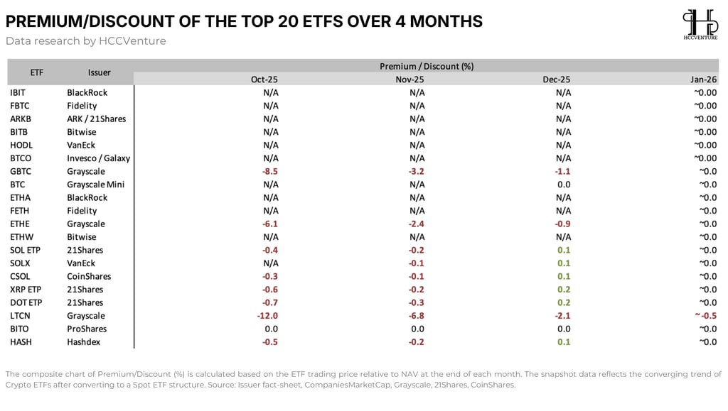 Đáng chú ý, các sản phẩm từng giao dịch với mức chiết khấu sâu như GBTC và ETHE của Grayscale hiện cũng đã thu hẹp chênh lệch đáng kể, tiến rất gần về mức cân bằng. Việc premium/discount gần như được “xóa bỏ” cho thấy niềm tin thị trường vào khả năng quy đổi tài sản cơ sở đã được khôi phục, đồng thời phản ánh rằng dòng vốn hiện tại không còn mang tính “thoát hàng” hay tái cấu trúc bị động, mà là dòng vốn chủ động, có tính lựa chọn.