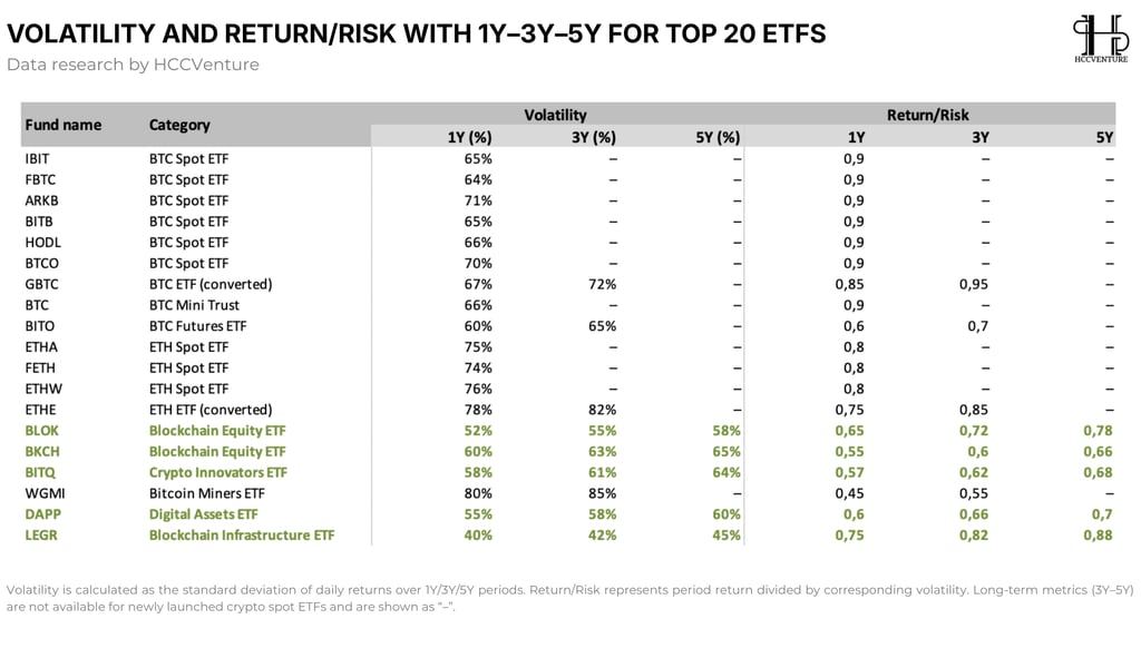 Nhóm Blockchain Equity ETF và Infrastructure ETF (BLOK, BITQ, DAPP, LEGR) cho thấy một cấu hình rủi ro – lợi nhuận hoàn toàn khác. Mức biến động của nhóm này thấp hơn rõ rệt (40–60%), trong khi hệ số return/risk lại cải thiện dần theo thời gian, thậm chí đạt tới 0,88 ở LEGR trong khung 5 năm.