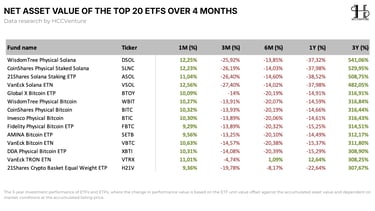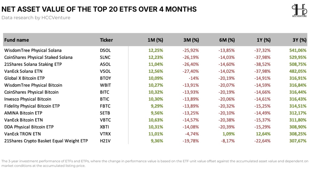 Nhóm Solana ETPs nổi bật ở hiệu suất ngắn hạn, với mức tăng trên 11–12% trong 1 tháng, cao hơn mặt bằng chung của Bitcoin ETP. Điều này cho thấy khẩu vị rủi ro đã bắt đầu mở rộng ra ngoài Bitcoin, đặc biệt ở các sản phẩm staking hoặc physical Solana tại châu Âu. Tuy vậy, hiệu suất 3–6 tháng vẫn âm sâu, phản ánh rằng dòng tiền vào Solana ETF hiện mang tính thăm dò và chiến thuật, chưa phải là sự tái định vị dài hạn của vốn tổ chức.