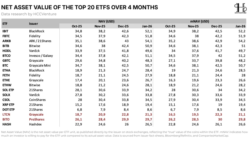 Bảng thống kê NAV và mNAV của Top 20 Crypto ETFs cho thấy một tín hiệu rất rõ ràng: giá trị nội tại của các ETF crypto đang tăng đồng bộ trên diện rộng, phản ánh lực cầu bền vững đối với tài sản cơ sở thay vì biến động mang tính đầu cơ ngắn hạn. Hầu hết các ETF Bitcoin spot lớn như IBIT, FBTC, ARKB, BITB hay BTCO đều ghi nhận NAV tăng mạnh trong tháng gần nhất, với mức giá trên 50 USD, cho thấy Bitcoin đang được tích lũy thông qua kênh ETF với cường độ cao. Đây là dấu hiệu điển hình của dòng vốn tổ chức, khi việc mua vào BTC diễn ra đều đặn thông qua cơ chế tạo rổ ETF thay vì mua bán trực tiếp trên thị trường spot.