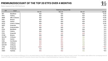 Sự biến mất gần như hoàn toàn của các mức discount sâu (–5% đến –10%) trong toàn bộ bảng dữ liệu hiện tại. Trong bối cảnh ETF crypto, discount sâu thường đi kèm với ba yếu tố tiêu cực từ việc dòng vốn rút ròng đến thanh khoản kém và niềm tin suy yếu. Việc không còn hiện tượng này cho thấy crypto market hiện không chịu áp lực bán mang tính hệ thống từ kênh ETF, trái lại đang ở trạng thái cân bằng – thậm chí là được nâng đỡ bởi dòng tiền mới.