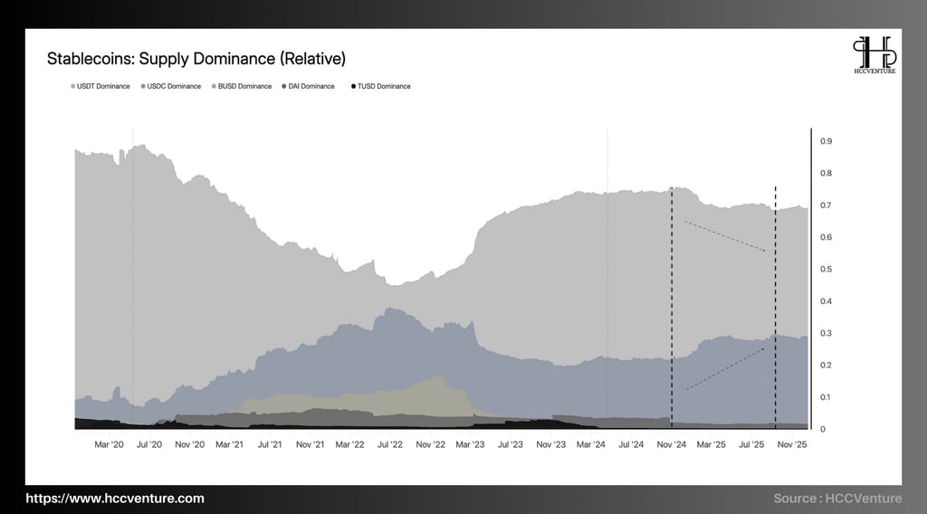 Tính đến cuối 2025, USDT vẫn duy trì dominance ở vùng xấp xỉ 65–70% tổng cung stablecoin, thấp hơn đỉnh phòng thủ năm 2023 nhưng cao hơn đáng kể so với đáy chu kỳ 2021. Điều này cho thấy: