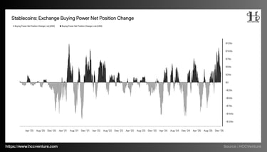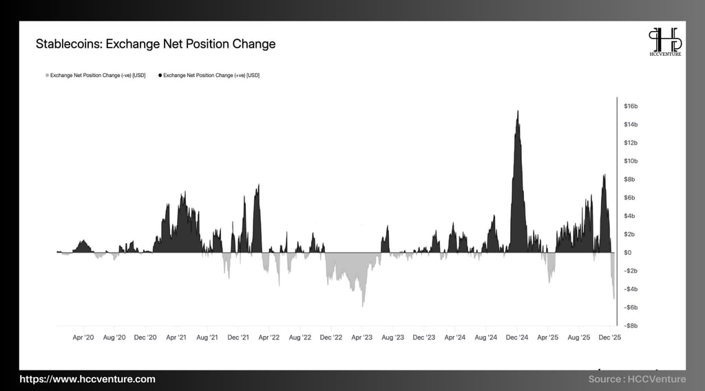 Về mặt cấu trúc chu kỳ, đây là điều kiện cần cho một pha mở rộng xu hướng bền vững. Lịch sử cho thấy: không có chu kỳ tăng trưởng mạnh nào bắt đầu khi stablecoin trên sàn ở mức thấp, và ngược lại, các pha tăng lớn đều được dẫn dắt bởi giai đoạn tích lũy thanh khoản tương tự hiện nay.