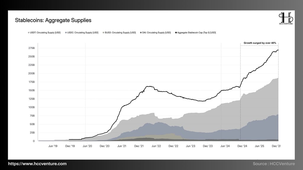 Kể từ nửa cuối năm 2024 đến nay, tổng cung stablecoin đã tăng tốc trở lại một cách liên tục, vượt mốc 170 tỷ USD và hiện tiến sát vùng 270–280 tỷ USD, tương đương mức tăng trưởng hơn 40% chỉ trong chưa đầy 12 tháng. Quy mô mở rộng này chỉ từng xuất hiện trong các giai đoạn đầu chu kỳ tăng lớn (2017 và 2020–2021).