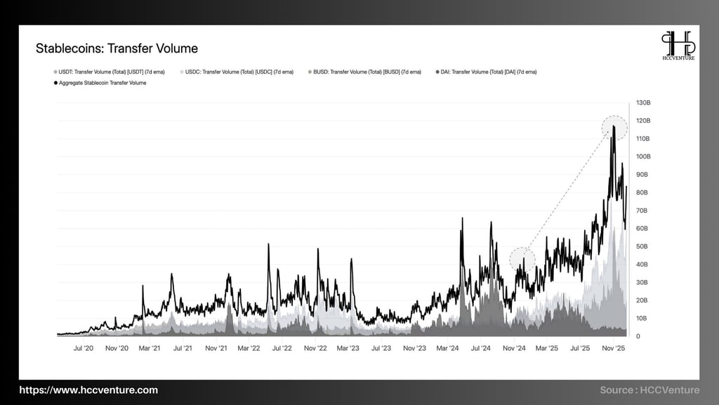So với đáy chu kỳ 2022–2023, khi transfer volume nhiều thời điểm chỉ quanh 10–15 tỷ USD, mức hiện tại cao hơn gấp 6–8 lần, phản ánh một sự quay trở lại rõ rệt của thanh khoản hệ thống.
