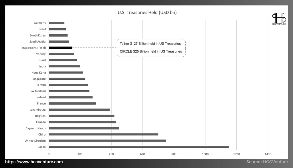 Mặc dù quy mô tuyệt đối vẫn nhỏ hơn các cường quốc tài chính, điều quan trọng nằm ở bản chất của chủ thể nắm giữ stablecoins không phải quốc gia, không phải ngân hàng trung ương, mà là các thực thể phát hành tiền kỹ thuật số tư nhân, nhưng lại tham gia trực tiếp vào thị trường nợ công Hoa Kỳ.
