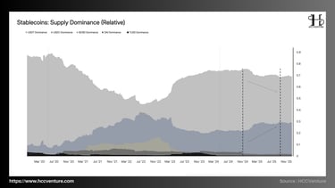 Một đặc điểm nổi bật của chu kỳ hiện tại là sự tái cấu trúc bên trong tổng cung stablecoin. USDT tiếp tục đóng vai trò trụ cột thanh khoản, chiếm tỷ trọng lớn nhất và là động lực chính dẫn dắt tăng trưởng. Trong khi đó, USDC sau giai đoạn suy giảm mạnh năm 2023 đã quay trở lại xu hướng mở rộng ổn định, phản ánh sự hồi phục niềm tin của dòng vốn tổ chức.