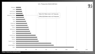 Quy mô này đặt stablecoins cao hơn hoặc ngang bằng với các quốc gia như Đức, Israel, Hàn Quốc, Saudi Arabia, và tiệm cận nhóm các nền kinh tế trung bình – lớn trong danh sách nắm giữ nợ công Hoa Kỳ.