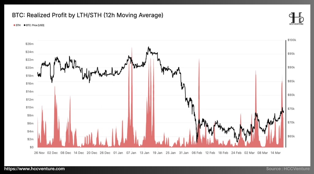 Biểu đồ cho thấy rõ ràng rằng trong suốt giai đoạn phục hồi từ đầu tháng 2/2026, khi giá Bitcoin bật tăng từ vùng thấp nhất chu kỳ, realized profit của STH đã xuất hiện các đỉnh nhọn liên tục. Đáng chú ý nhất là động thái tuần vừa qua: khi giá tiến sát và vượt qua 74.000 USD, đường trung bình động 12 giờ của STH Realized Profit đã tăng vọt lên mức 18,4 triệu USD mỗi giờ - mức cao nhất kể từ các đỉnh spike trong tháng 1/2026.
