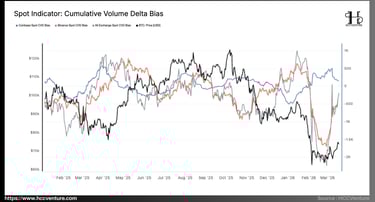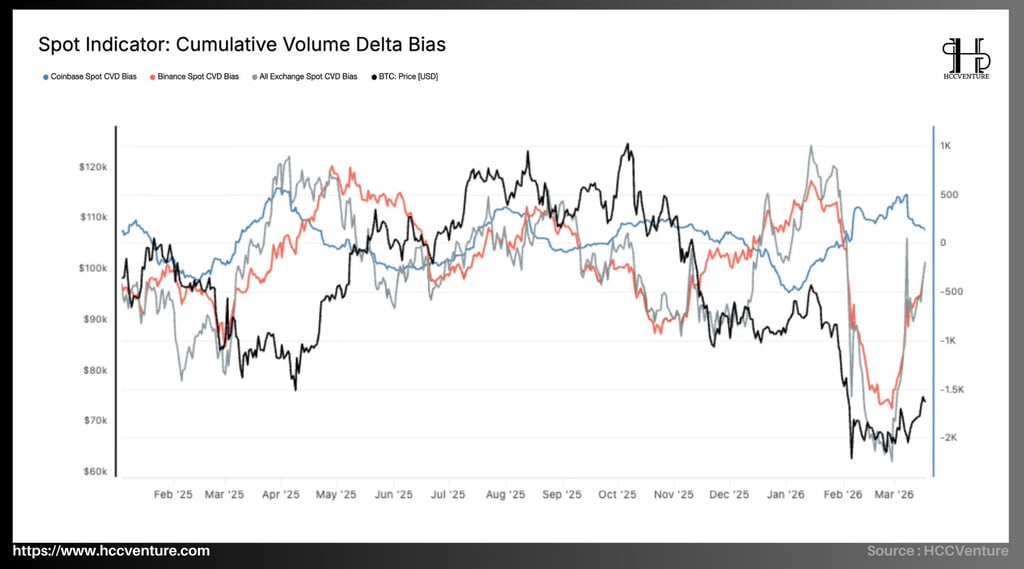 Cumulative Volume Delta Bias từ HCCVenture cung cấp cái nhìn chi tiết và thuyết phục nhất về sự chuyển dịch này, với ba đường CVD riêng biệt – Coinbase (màu xanh dương), Binance (màu đỏ) và All Exchanges (màu xám) - so sánh trực tiếp với đường giá Bitcoin (màu đen) trong giai đoạn từ tháng 2/2025 đến tháng 3/2026.