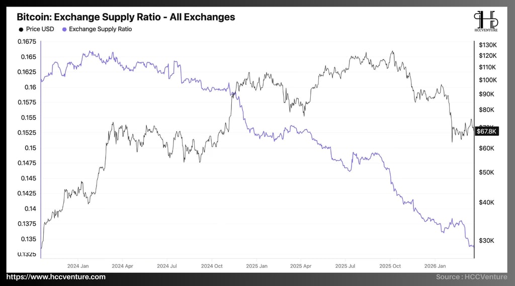 Việc chỉ số Exchange Supply Ratio đạt đáy chu kỳ trong bối cảnh giá duy trì trên 67.000 USD cho thấy long-term holders không chỉ giữ mà còn tích lũy thêm, giảm thiểu rủi ro thanh lý cascade và nâng cao tính bền vững của đà tăng. Đây là mức thấp nhất kể từ đầu chu kỳ 2024, thấp hơn cả giai đoạn giá chạm đỉnh 2025, khẳng định rằng hành vi HODLing đang ở giai đoạn mạnh mẽ nhất lịch sử gần đây.