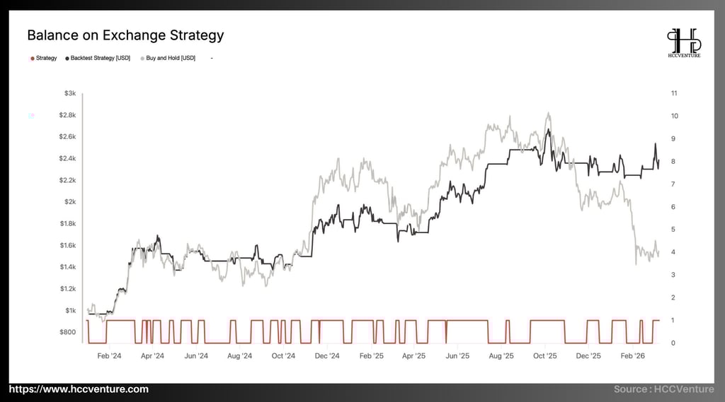 Tuy nhiên, từ cuối năm 2025 đến tháng 2/2026, đường xám lao dốc mạnh xuống mức thấp nhất khoảng 1.500 USD, thể hiện đầy đủ tác động của drawdown gần đây khi nguồn cung trên sàn vẫn còn dư thừa ở một số giai đoạn chuyển tiếp. Ngược lại, đường Backtest Strategy của Balance on Exchange duy trì quỹ đạo ổn định hơn, đạt đỉnh khoảng 2.700 USD vào cùng kỳ và kết thúc giai đoạn ở mức khoảng 2.500 USD - cao hơn đáng kể so với Buy and Hold tại thời điểm hiện tại.