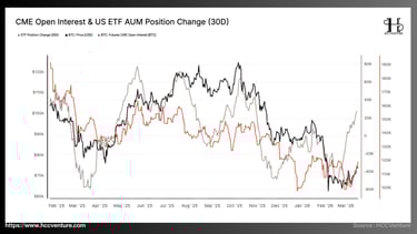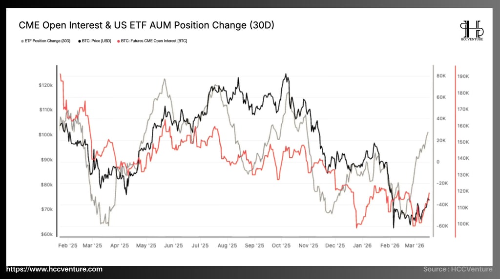 Sự chênh lệch rõ nét giữa ETF inflows tăng tốc và CME open interest vẫn khiêm tốn phản ánh cấu trúc thị trường lành mạnh: giá tăng được hỗ trợ bởi dòng vốn thực vào spot exposure chứ không phải bởi vị thế leveraged speculative. Đây chính là mô hình điển hình của giai đoạn đầu bull market chuyển tiếp, nơi institutional demand quay trở lại mà không kèm theo rủi ro thanh lý cascade từ futures.