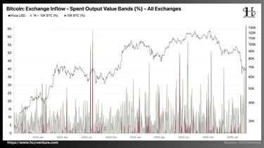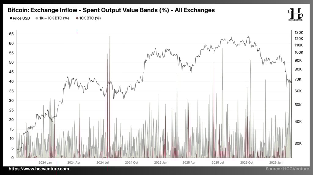 Exchange Inflow - Spent Output Value Bands (%) khẳng định rằng hoạt động của large entity trên sàn đang ở trạng thái kiểm soát tối ưu, với tỷ lệ inflow lớn giảm mạnh so với đỉnh lịch sử và được thị trường hấp thụ hoàn toàn trong giai đoạn phục hồi hiện tại.