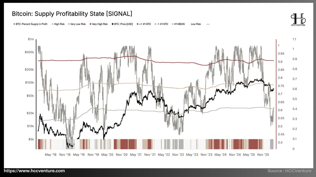 Biểu đồ Supply Profitability State từ HCCVenture minh họa rõ ràng hành trình của chỉ số này qua nhiều chu kỳ. Lịch sử cho thấy, mọi đợt phục hồi từ đáy bear market sâu vào giai đoạn đầu bull market đều được xác nhận khi chỉ số này leo từ dưới ngưỡng -1 standard deviation (khoảng 60%) lên mức trung bình dài hạn 75%. Động thái giá gần đây đã đẩy chỉ số Percent of Supply in Profit lên đúng mức 60%, hoàn toàn phù hợp với các nhịp bounce đầu tiên tại đáy chu kỳ trước đây, nơi kiệt sức thị trường thường xuất hiện ngay ở lần thử phục hồi đầu tiên.