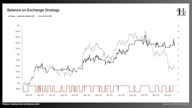 So với điểm thấp nhất của Buy and Hold trong drawdown tháng 2/2026 (1.500 USD), Backtest Strategy hiện vượt trội khoảng 67%, chứng tỏ khả năng bảo vệ vốn và capture upside một cách có hệ thống nhờ việc điều chỉnh balance trên sàn dựa trên tín hiệu on-chain.
