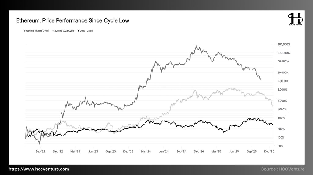 Cuối 2024 – đầu 2025 giá hình thành đỉnh thấp hơn tương đối so với quỹ đạo lịch sử nếu chuẩn hóa theo % tăng từ đáy, tốc độ tăng trưởng lại bị nén, phản ánh mạnh quy mô vốn hóa lớn hơn, dòng vốn phân bổ đa dạng sang L2, restaking, AI-chain và ETH không còn là “beta cao” nhất trong hệ sinh thái.