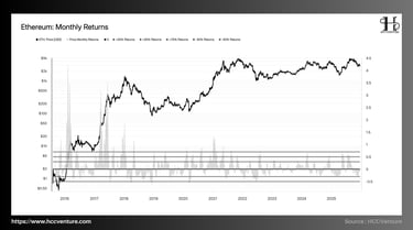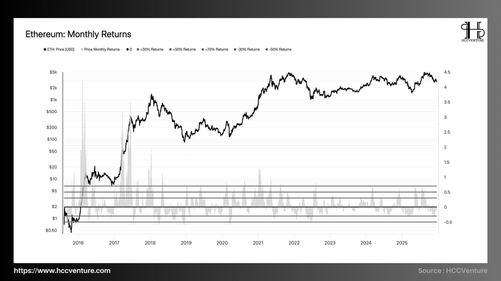 Tính đến đầu năm 2025, ETH giao dịch quanh vùng $3,000–$3,500, cao hơn khoảng 3.5–4 lần so với đáy chu kỳ 2022 (~$880–$1,000). Tuy nhiên, cấu trúc lợi suất tháng cho thấy thị trường Ethereum không còn vận động theo mô hình bùng nổ – sụp đổ, mà đang tiến dần về một tài sản tài chính trưởng thành hơn, với phân phối lợi nhuận hẹp và ổn định hơn.
