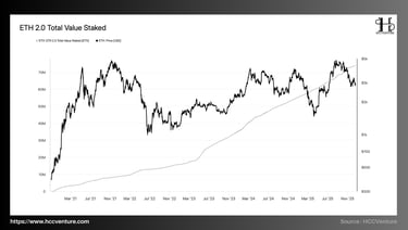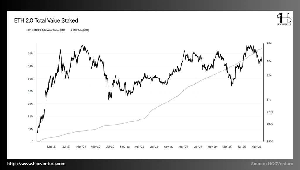 Tích lũy cấu trúc và trưởng thành tài chính từ 2024 đến nay, Total Value Staked tăng liên tục từ ~30 triệu lên trên 70 triệu ETH cùng mức độ hiện tại cao gấp hơn 7 lần so với đáy lịch sử. Mặc dù bất chấp các pha điều chỉnh giá mạnh trong năm 2025, Đường Total Value Staked gần như không bị ảnh hưởng bởi biến động giá ngắn hạn trong các nhịp giảm sâu của ETH, staking không suy giảm tương ứng.