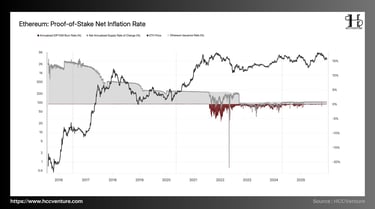 Từ giai đoạn Proof-of-Work (PoW) với issuance cao và cứng nhắc, Ethereum đã chuyển sang Proof-of-Stake (PoS) với issuance tối thiểu, linh hoạt và phụ thuộc vào mức độ tham gia staking, đồng thời kết hợp với cơ chế đốt phí EIP-1559. Kết quả là đến giai đoạn 2023–2025, issuance danh nghĩa của ETH đã giảm hơn 85–90% so với đỉnh lịch sử, đưa Ethereum vào một trạng thái tiền tệ hoàn toàn mới.