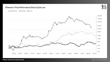 Ethereum bước sang năm 2025 trong trạng thái tăng trưởng chu kỳ nhưng suy giảm động lượng tương đối so với Bitcoin, phản ánh rõ quá trình tái định giá vai trò của ETH trong hệ sinh thái crypto trưởng thành. Tính đến đầu 2025, ETH đã tăng khoảng +350% đến +400% so với đáy chu kỳ 2022 (~$880–$1,000), thấp hơn đáng kể so với: