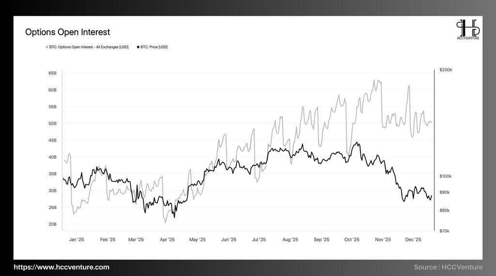 Mức Options OI hiện tại, thấp hơn đỉnh nhưng cao hơn rõ rệt so với đáy lịch sử, xác nhận rằng Bitcoin chưa bước vào pha suy thoái chu kỳ, mà đang nằm trong giai đoạn chuyển tiếp – nơi rủi ro được tái định giá thay vì bị tháo chạy. Nói cách khác, Options Open Interest hiện tại đóng vai trò ổn định thị trường, hạn chế các cú sốc biến động cực đoan, thay vì khuếch đại dao động giá như trong các pha hưng phấn.