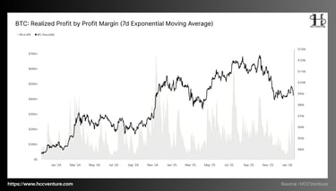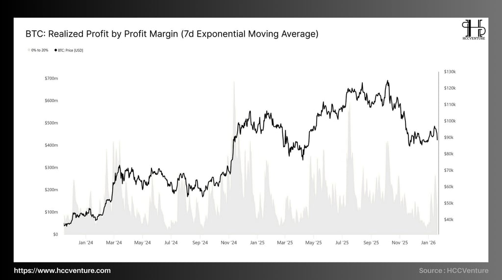 Tại thời điểm đầu năm 2026, Realized Profit by Profit Margin (EMA 7 ngày) tập trung vào nhóm lợi nhuận thấp 0–20%, đại diện cho các nhà đầu tư ngắn hạn, nhà giao dịch chiến thuật và những người bán gần điểm hòa vốn. Đây là nhóm có độ nhạy cao với biến động giá và thường đóng vai trò quyết định trong các pha tích lũy – phân phối trung gian của chu kỳ.