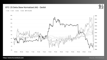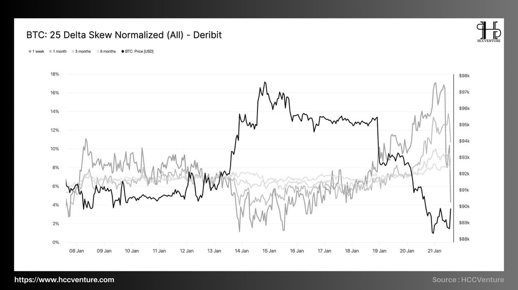 Nhà đầu tư sẵn sàng trả phí cao hơn đáng kể để mua quyền chọn bán, thay vì giữ vị thế không phòng vệ. Áp lực này không đến từ kỳ vọng sụp đổ dài hạn, mà từ nhu cầu bảo vệ vị thế spot hoặc futures trong ngắn hạn. Đáng chú ý, ngay sau các phát biểu và sự kiện vĩ mô (như các thảo luận chính sách tại Davos), put richness đã nhanh chóng bị “monetiz nghĩa là quyền chọn bán được chốt lời, Skew bắt đầu giảm trở lại gần như với tốc độ tăng trước đó.