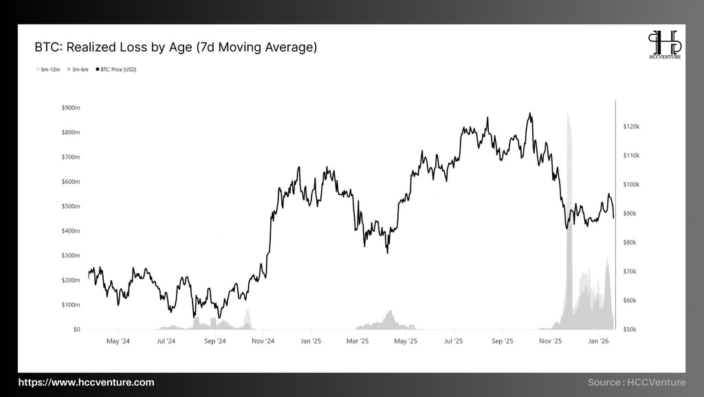 Hiện tại, phần lớn realized loss đến từ nhóm nhà đầu tư nắm giữ 3–6 tháng, với giá trị thua lỗ trung bình 7 ngày dao động trong vùng 200–300 triệu USD/ngày, có thời điểm spike lên cao hơn. Nhóm 6–12 tháng đóng vai trò thứ yếu, với biên độ thua lỗ thấp hơn đáng kể và không tạo thành các đỉnh cực đoan. Các nhóm dài hạn hơn (LTH thực thụ, >1 năm) gần như không xuất hiện trong dữ liệu thua lỗ, cho thấy họ không bị buộc phải thoát vị thế.