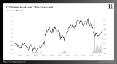 Realized Loss by Age đo lường giá trị thua lỗ đã được hiện thực hóa (realized loss) khi Bitcoin được chi tiêu, phân tách theo độ tuổi nắm giữ của UTXO. Việc áp dụng trung bình động 7 ngày giúp làm mượt dữ liệu, qua đó phản ánh rõ hơn hành vi bán ra mang tính cấu trúc thay vì các nhiễu động ngắn hạn.