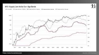 So với đáy chu kỳ 2022–2023, khi tỷ trọng nguồn cung 1y+ giảm mạnh do capitulation và tái phân phối, cấu trúc hiện tại cho thấy Bitcoin đang ở trạng thái nguồn cung dài hạn rất “khóa chặt”, bất chấp việc giá đã trải qua các nhịp điều chỉnh đáng kể.