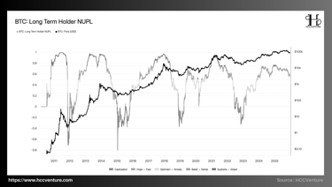 Long-Term Holder Net Unrealized Profit/Loss (LTH NUPL) là một trong những thước đo quan trọng nhất để đánh giá trạng thái tâm lý, mức độ lợi nhuận chưa thực hiện và hành vi chu kỳ của nhóm nhà đầu tư nắm giữ dài hạn (coin age > 155 ngày).