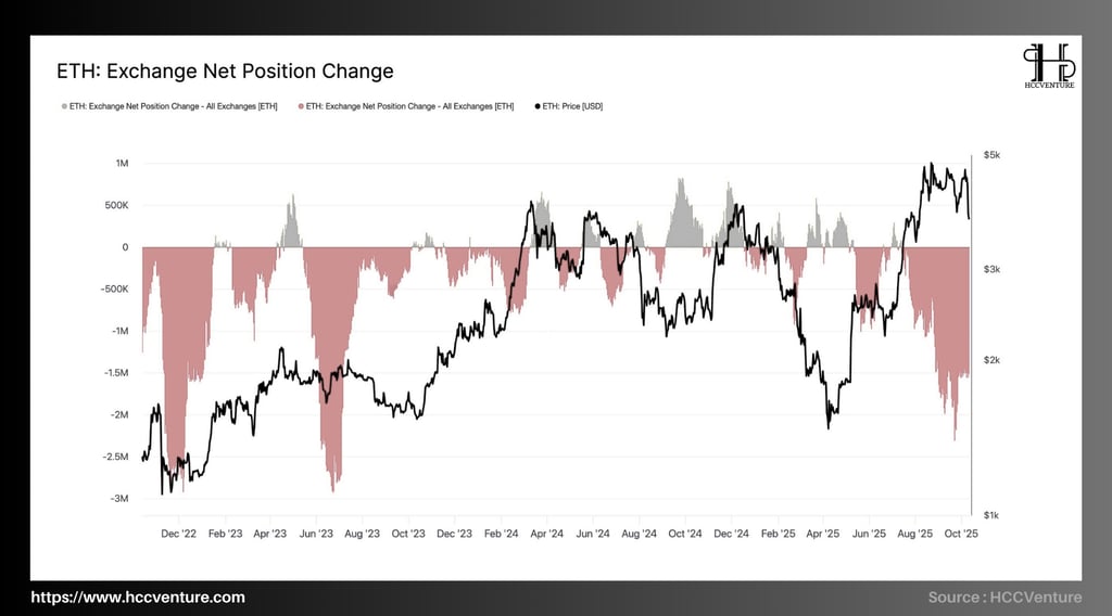 Giai đoạn cuối 2022 từng ghi nhận khoảng -2,8 đến -3,0 triệu ETH/30D (đáy hoảng loạn hệ thống). Khác biệt then chốt là khi đó giá giảm sâu, còn hiện nay giá cao ổn định, cho thấy động cơ rút ròng là tích lũy/giữ dài hạn, không phải rút do lo ngại rủi ro sàn.