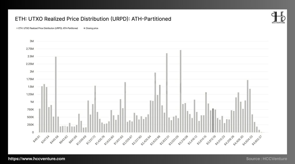 Trong chu kỳ 2021, URPD tập trung dày ở $3–4k và thưa ở vùng >ATH, sau đó giá suy giảm mạnh vì overhang cung nhanh chóng xuất hiện khi nhà đầu tư cũ xả. Hiện tại, cụm $4.10–4.60k đã trở thành cost-basis mới của phần lớn dòng vốn, trong khi không có dải dày tương đương phía trên. Điều này cho thấy sự chấp nhận định giá cao chứ không phải “đu đỉnh tập thể”; rủi ro bán xả hệ thống tại vùng đỉnh thấp hơn so với 2021.