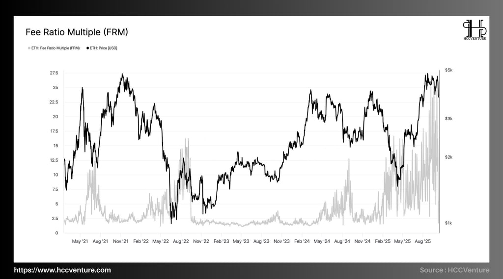 Hiện tại, trong quý IV năm 2025, Fee Ratio Multiple (FRM) của Ethereum dao động quanh mức 20–25, thậm chí nhiều phiên vượt ngưỡng 25, trong khi giá ETH duy trì ổn định trong vùng 4.500–4.800 USD. Đây là cấu trúc thể hiện sự cân bằng bền vững giữa hiệu suất mạng lưới và áp lực phí – yếu tố hiếm gặp trong các chu kỳ trước. Nếu so sánh với đỉnh năm 2021, khi giá ETH lập ATH nhưng FRM lại giảm mạnh về vùng thấp do tắc nghẽn và phí giao dịch L1 tăng đột biến, có thể thấy chất lượng của chu kỳ tăng hiện nay vượt trội hơn hẳn. Khi đó, FRM thấp phản ánh sự quá tải hệ thống – dòng cầu đầu cơ lấn át cầu thực, tạo nên đỉnh hưng phấn mang tính ngắn hạn.