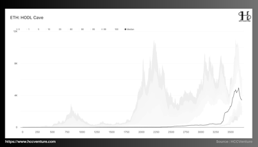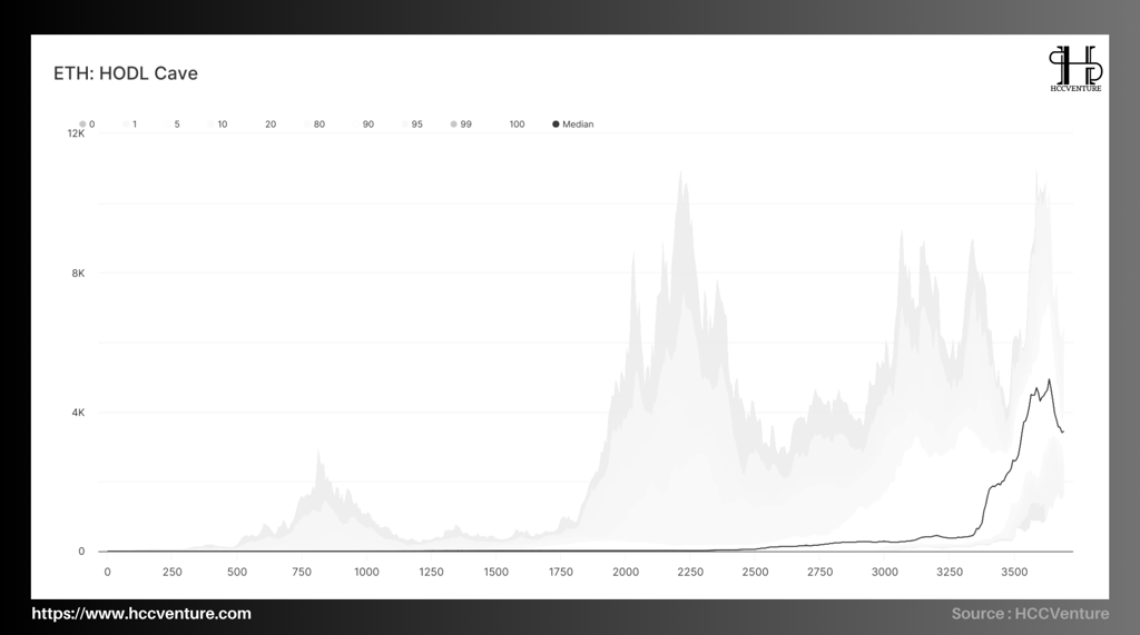 HODL Cave là lát cắt tuổi thọ nguồn cung (age distribution) cho thấy bao nhiêu ETH đang “ngủ yên” theo từng dải thời gian nắm giữ. Khác với giá – vốn nhiễu theo chu kỳ – HODL Cave đo lường cấu trúc cung nền tảng dày lên, áp lực bán cơ học giảm và biên độ tăng giá bền hơn. Dữ liệu cập nhật cho thấy phần cung dài hạn của Ethereum đã tăng lên mức cao nhất chu kỳ, song song với staking và mức sử dụng mạng lưới kỷ lục.