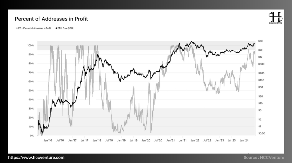 Tỷ lệ địa chỉ đang có lãi là một trong các thước đo “độ rộng” của xu hướng đáng tin cậy nhất trên chuỗi Ethereum. Khi càng nhiều địa chỉ ở trạng thái lãi, khả năng hình thành nền giá bền vững càng cao do áp lực bán cưỡng bức suy giảm.