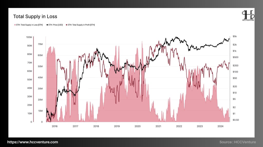 Total Supply in Loss đo tổng lượng ETH đang có giá vốn cao hơn giá hiện tại. Đây là chỉ báo “độ sâu” của áp lực bán tiềm năng càng thấp, overhang cung càng nhỏ và xu hướng nền càng bền.