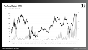 Fee Ratio Multiple (FRM) và Burn Rate (Base Fee) mang ý nghĩa sâu sắc. FRM tiếp tục duy trì trên vùng 10–12 lần, thể hiện mức thu nhập phí so với giá trị an ninh mạng cao, trong khi lượng burn vẫn duy trì đều đặn dù không còn bùng nổ như thời kỳ DeFi Summer.