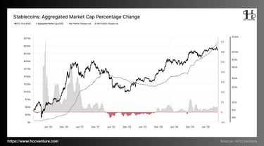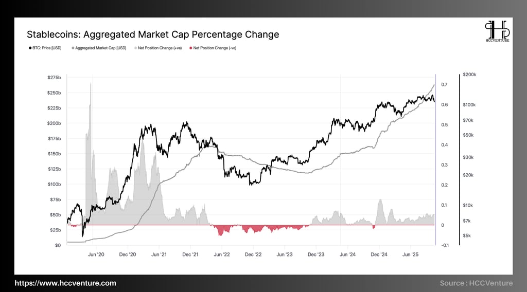 Việc vốn hóa stablecoin tăng liên tục trong suốt nửa cuối 2024 và duy trì tốc độ dương sang quý IV/2025 thể hiện sự hồi phục bền vững của dòng vốn USD hóa, đóng vai trò như nhiên liệu thanh khoản hỗ trợ chu kỳ tăng trưởng mới của Bitcoin và các tài sản rủi ro.