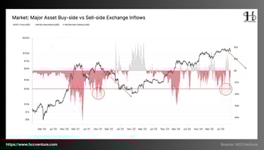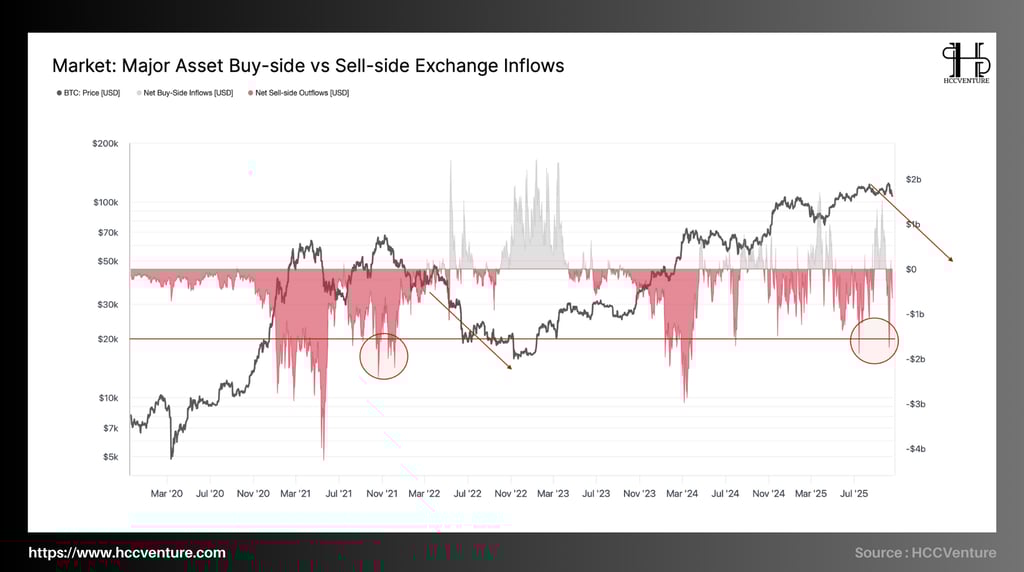 Chỉ báo Buy-side vs Sell-side Exchange Inflows phản ánh sự chênh lệch giữa lượng vốn nạp vào sàn để bán và lượng vốn rút ra để nắm giữ dài hạn. Quan sát dữ liệu mới nhất, giai đoạn cuối Q3 đến đầu Q4/2025, thị trường Bitcoin đang chứng kiến mức outflow âm mạnh, tương tự các pha điều chỉnh của năm 2021 và 2022.