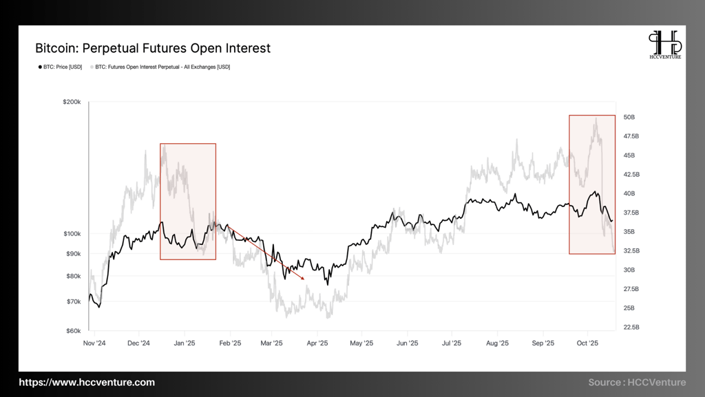 Điểm đáng chú ý là giá BTC chỉ giảm tương đối vừa phải (~10–12%), trong khi OI sụt gần 30%, hàm ý rằng cú giảm này chủ yếu mang tính “thanh lọc kỹ thuật” hơn là bán tháo cơ bản. Nói cách khác, phần lớn hợp đồng bị đóng không xuất phát từ nỗi sợ hãi hệ thống mà do các vị thế bị cưỡng chế (forced closure) khi funding rate giảm mạnh và các sàn siết margin.