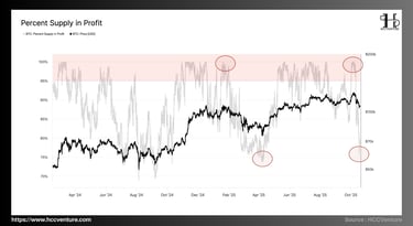 PSiP giảm ~22–24 điểm % từ đỉnh bão hòa xuống vùng cân bằng, nhưng vẫn duy trì trên ngưỡng trung tính 70% khi đó lợi nhuận toàn mạng bị triệt tiêu vừa phải, không tạo hiệu ứng thua lỗ lan tỏa. Khi PSiP rời vùng 99% xuống 75–77%, lượng UTXO “nhạy cảm với chốt lời” giảm mạnh, kết hợp việc LTH Net Position Change dịch về trung tính, nguồn cung sẵn sàng bán không còn lớn.