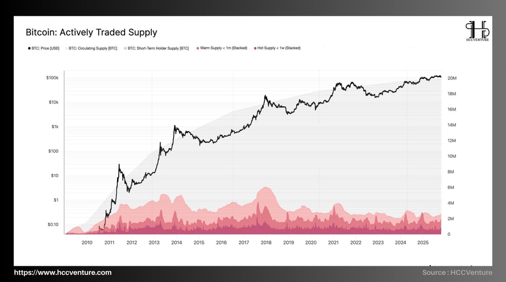 Dữ liệu hiện tại cho thấy, tính đến cuối tháng 10 năm 2025, lượng cung Bitcoin được giao dịch tích cực duy trì ở mức thấp lịch sử, chỉ khoảng 1,87 triệu BTC (<9,5% tổng cung lưu hành) – đây là mức thấp tương đương giai đoạn giữa năm 2016 và cuối năm 2020, hai thời điểm ngay trước các chu kỳ tăng trưởng mạnh mẽ.