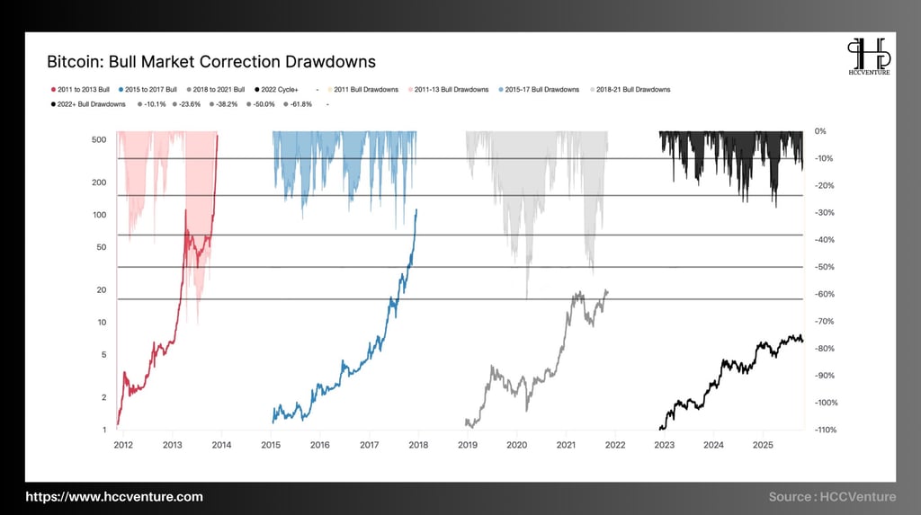 Bull Market Correction Drawdowns đo lường mức độ điều chỉnh giá (tính theo %) của Bitcoin trong từng chu kỳ tăng trưởng kể từ năm 2011. Lịch sử của Bitcoin cho thấy, mọi chu kỳ tăng giá đều tồn tại các pha điều chỉnh trung bình từ 25% đến 60%, đóng vai trò “cơ chế thanh lọc tự nhiên” giúp hấp thụ đòn bẩy và củng cố nền tảng tăng trưởng kế tiếp.