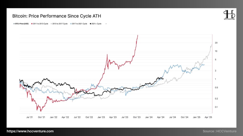 Chu kỳ 2022 đến hiện tại, bắt đầu sau cú sụp giảm năm 2022 (-77%) do khủng hoảng thanh khoản và các sự kiện vĩ mô (FTX, lãi suất Fed, v.v.), đang thể hiện một mô hình điều chỉnh mới – ít sâu nhưng kéo dài hơn.