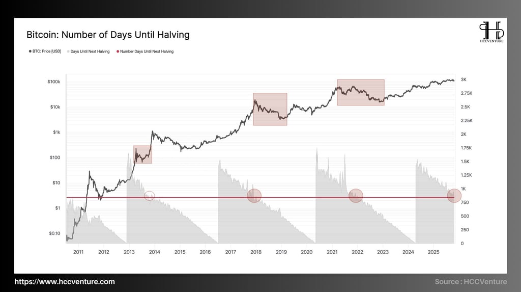 Xét trong các chu kỳ trước, khi số ngày đến Halving giảm xuống dưới mốc 1,000, thị trường thường bước vào pha tái định giá trung hạn.
