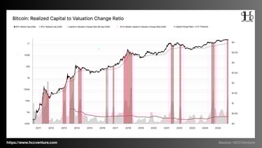 Bull Market Correction Drawdowns cho thấy các đợt điều chỉnh hiện tại (-23% đến -25%) vẫn nhẹ hơn đáng kể so với trung bình -38% đến -50% của các chu kỳ tăng trưởng trước. Mặt khác, Realized Capital to Valuation Change Ratio (RCVCR), giá trị 90 ngày hiện ở mức ~0,8–0,85, nằm trên ngưỡng 0,75 – vùng được xem là “nóng” của dòng vốn.
